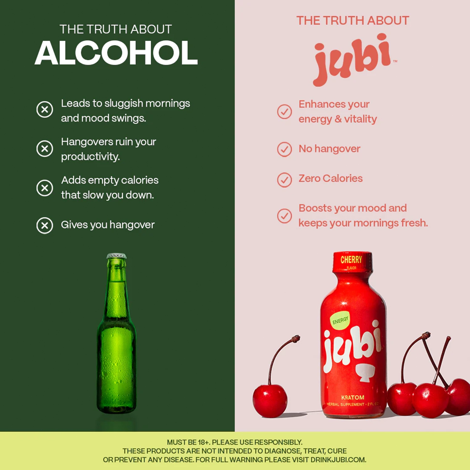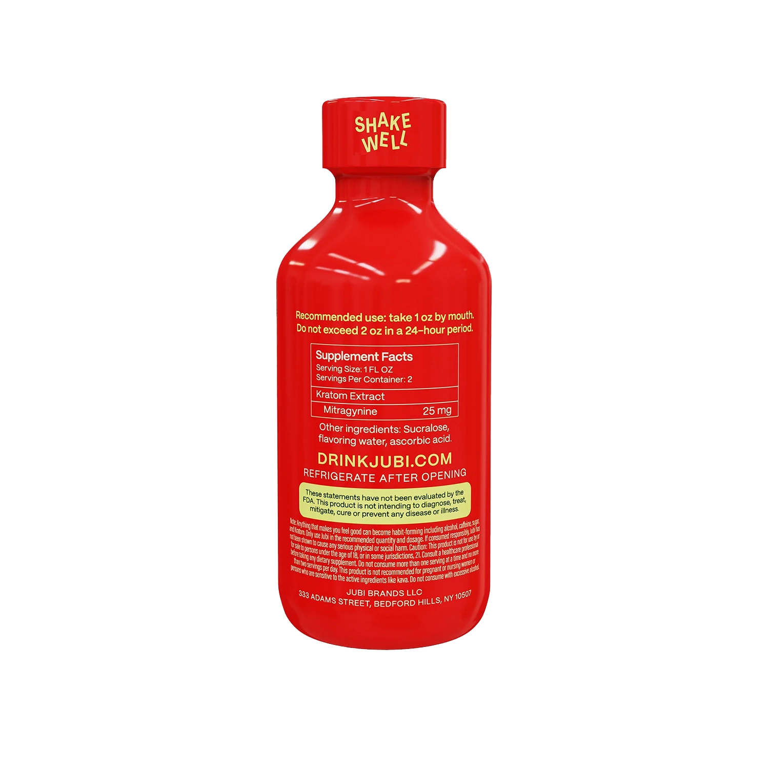 WARNING: OUR KRAT0M PRODUCTS ARE NOT FOR USE BY OR FOR SALE TO PERSONS UNDER THE AGE OF 18 OR THE LEGAL AGE FOR KRAT0M USE IN YOUR STATE. ALL JUBI PRODUCTS SHOULD BE USED ONLY AS DIRECTED ON THE LABEL. THEY SHOULD NOT BE USED IF YOU ARE PREGNANT OR NURSING. CONSULT WITH A HEALTHCARE PROVIDER BEFORE USE IF YOU HAVE A SERIOUS MEDICAL CONDITION, USE PRESCRIPTION MEDICATIONS, OR TAKE DIETARY SUPPLEMENTS. YOU SHOULD ALSO CONSULT WITH A LICENSED HEALTHCARE PROVIDER ABOUT POTENTIAL INTERACTIONS OR OTHER POSSIBLE COMPLICATIONS BEFORE USING THESE PRODUCTS. KEEP OUT OF THE REACH OF CHILDREN AND PETS. DO NOT USE WHILE OPERATING MOTOR VEHICLES OR HEAVY MACHINERY. SOME JUBI PRODUCTS CONTAIN KRAT0M AND MAY BE HABIT FORMING OR LEAD TO ADDICTION. NO JUBI PRODUCTS ARE INTENDED TO DIAGNOSE, TREAT, CURE OR PREVENT ANY DISEASE